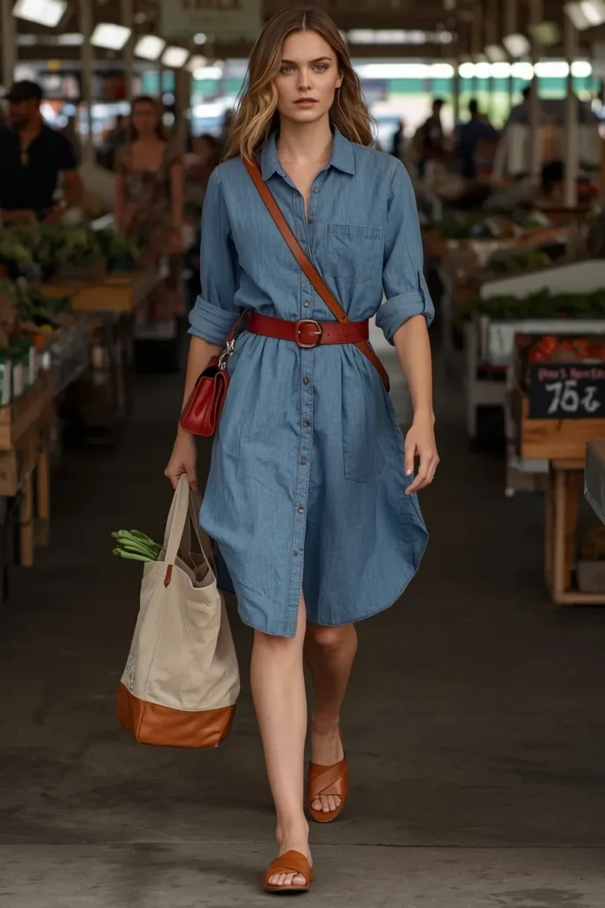 Versatile chambray transitions effortlessly from morning errands to afternoon gatherings. The shirt dress silhouette offers adjustable coverage through button positioning. A bold belt defines the waist and introduces celebratory color strategically.
