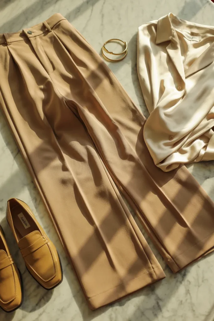 Wide-leg trousers have made a permanent home in sophisticated wardrobes, and for very good reason. In camel or oatmeal tones, they carry the kind of quiet authority that defines the old money aesthetic structured enough to feel intentional, relaxed enough to feel lived in. For women over 40, this silhouette is particularly flattering because it creates long clean lines while allowing ease of movement, which matters just as much as style at any age.